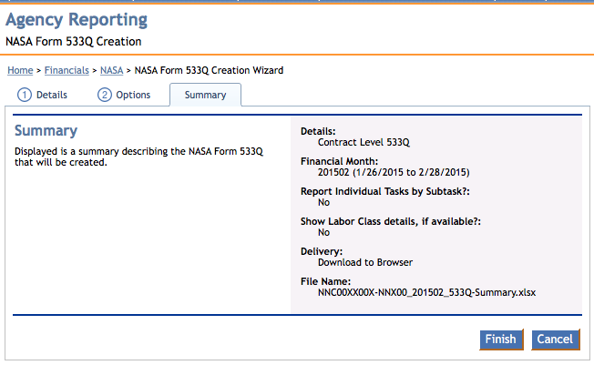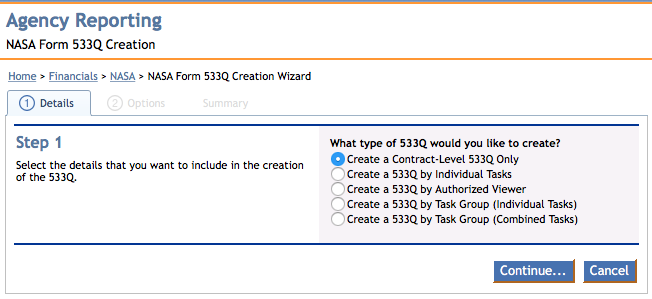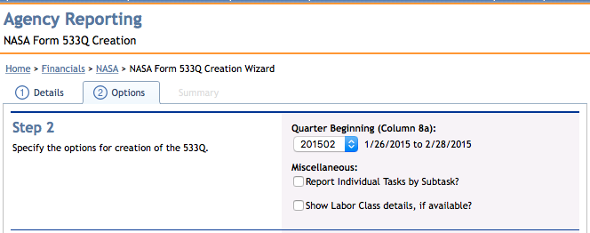 Modules > Financials > Agency Reporting > NASA Form 533Q Creation Wizard